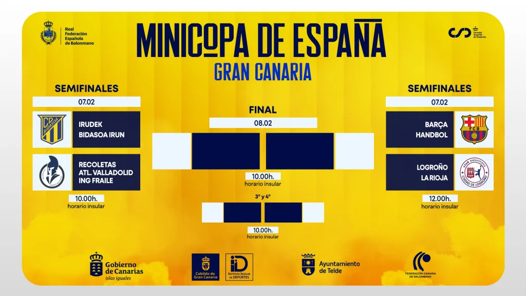 La jornada del sábado 7 de febrero estará marcada por las semifinales. A las 15:00 horas (horario insular) se disputará el primer duelo entre DICORPEBAL Logroño La Rioja y Recoletas Atlético Valladolid, mientras que a las 17:30 horas llegará el turno del enfrentamiento entre Barça e Irunek Bidasoa Irun, en un cruce de máxima exigencia deportiva.